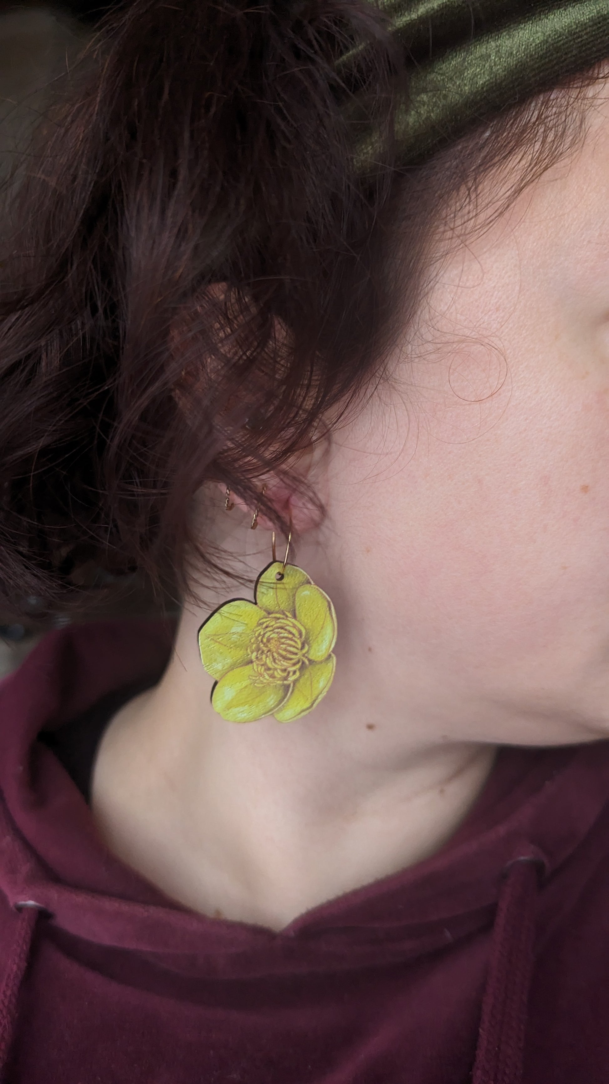 Boucles d'oreilles imprimées sur bois d'environ 4cm par 3,5cm (+2cm de créoles)
